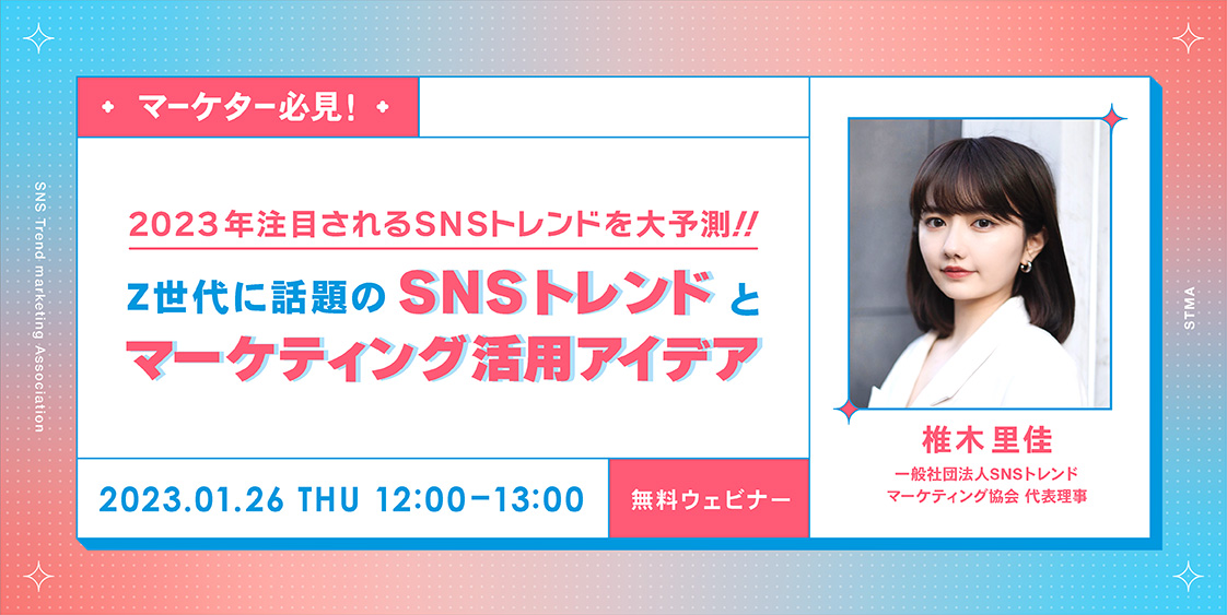 本セミナーでは、「一般社団法人 SNSトレンドマーケティング協会」の代表理事である椎木里佳氏をお迎えし、Z世代が注目するSNSトレンドとトレンドを活用したマーケティングアイデアの紹介、2023年に流行るであろうSNSトレンド予測を発表します。