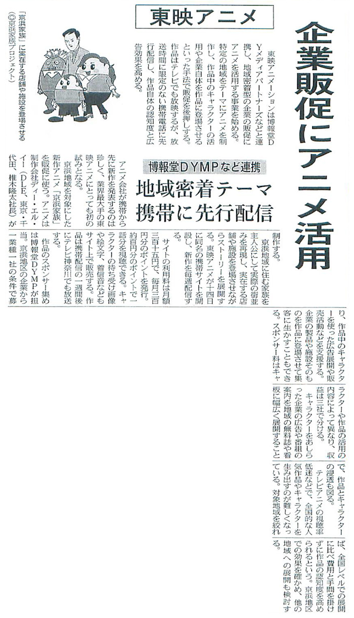 地域密着型企業販促にアニメ活用「京浜家族」(2009年1月13日・日経産業新聞) 地域密着型企業販促にアニメ活用「京浜家族」(2009年1月13日・日経産業新聞) 2009年1月13日(火)、日経産業新聞 掲載 ⇒記事を読む