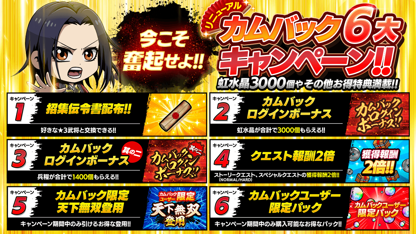 リニューアル後のカムバック六大キャンペーンでは、好きな武将が選べる「招集伝令書」のほか、ログインボーナスで、最大3000個の虹水晶、1400個の兵糧が獲得できます。