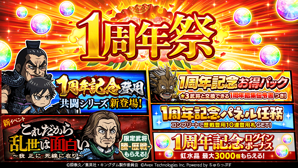 DLEの100%子会社であるちゅらっぷすとエイベックス・テクノロジーズ株式会社(東京都港区、代表取締役社長:岩永朝陽)は、『キングダムDASH!!』サービス開始1周年を記念した1周年祭の開催とVer.3.0.0へのアップデートを実施します。