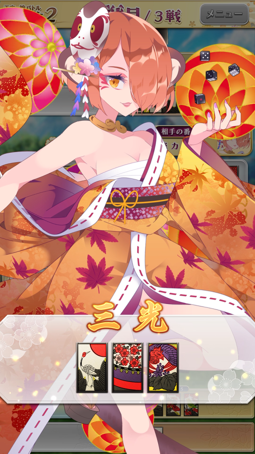 本作は花札の「こいこい」のルールを採用しており、3ラウンドの合計得点(文数)を対戦相手と競います。