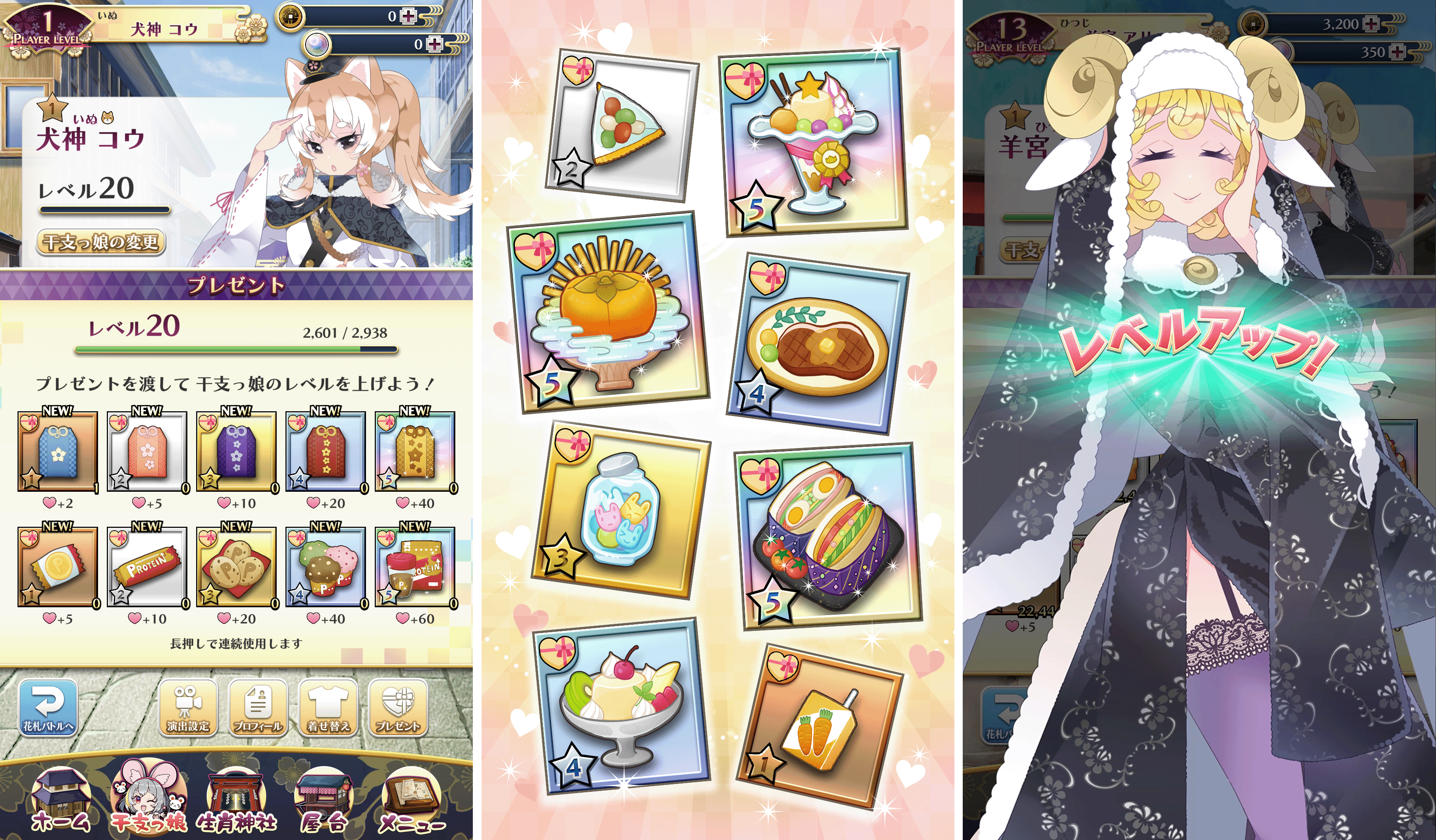『干支っ娘バトル』を遊ぶと報酬として、干支っ娘たちの「プレゼント」(好きなもの)が獲得できます。