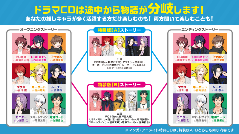 さらに、物語に深みを持たせるため、途中で物語が分岐する仕様となっており、それぞれに特装版A:キーボード(CV: 白井悠介)・マウス(CV:古川 慎)・ルーター(CV:坂泰斗)・モニター(CV:小笠原仁)。特装版B:USB・スマホ(CV: 鳴瀬友希)・電源コード(CV: 佐藤拓也)・イヤホン(CV: 増田俊樹)の別の物語が展開されます。