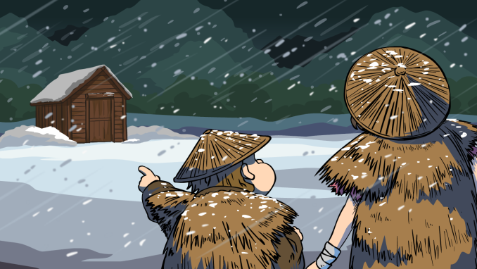 ある寒い冬の日、茂作と巳之吉という2人の男が山でひどい吹雪にあってしまいました。