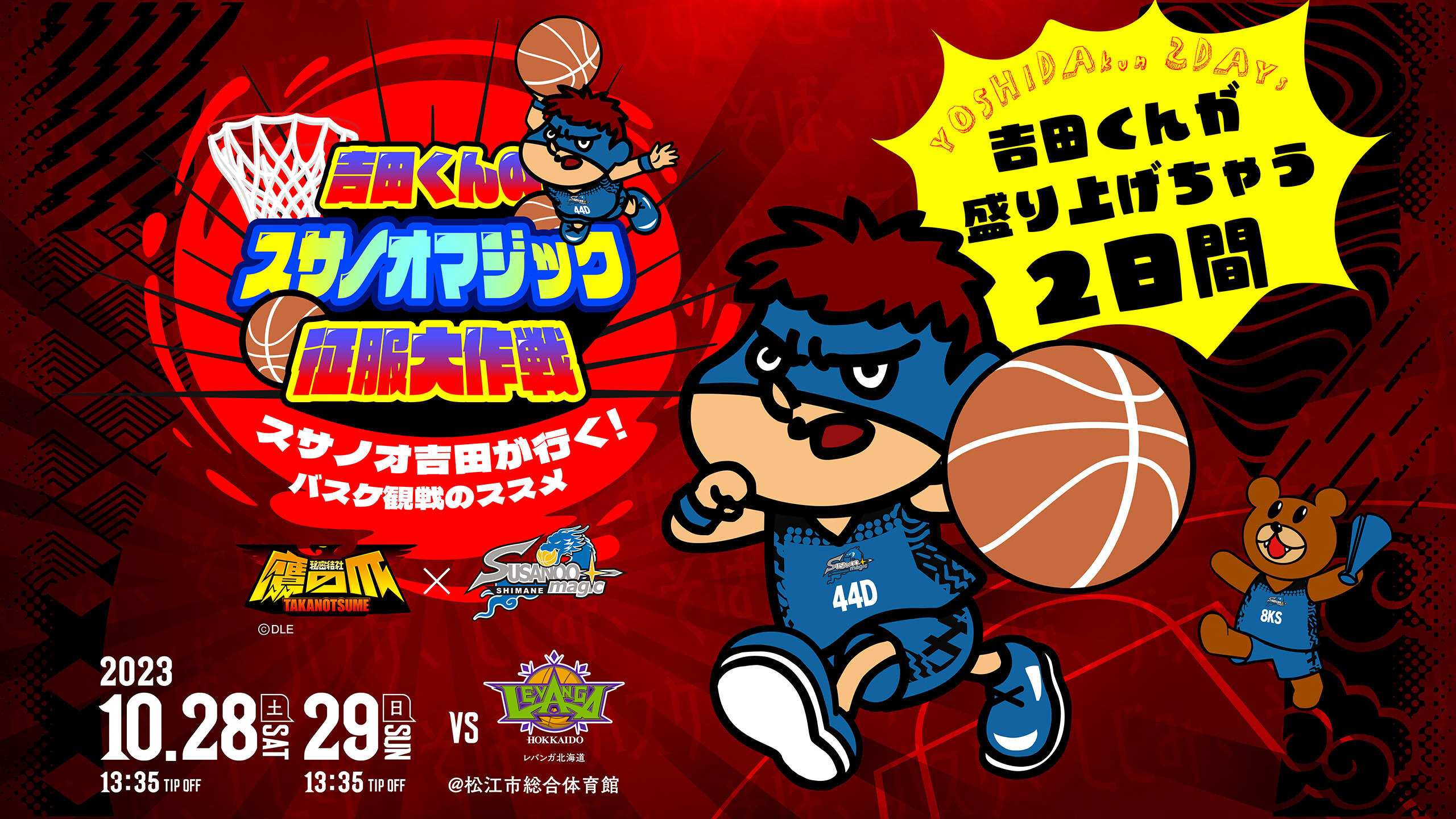 吉田くんの応援アンバサダー就任を記念して、島根スサノオマジックでは、10/28(土)・29 日(日)レバンガ北海道戦 ホームゲーム会場にてコラボイベント 『吉田くんのスサノオマジック征服大作戦スサノオ吉田が行く!バスケ観戦のススメ』 を実施いたします。
