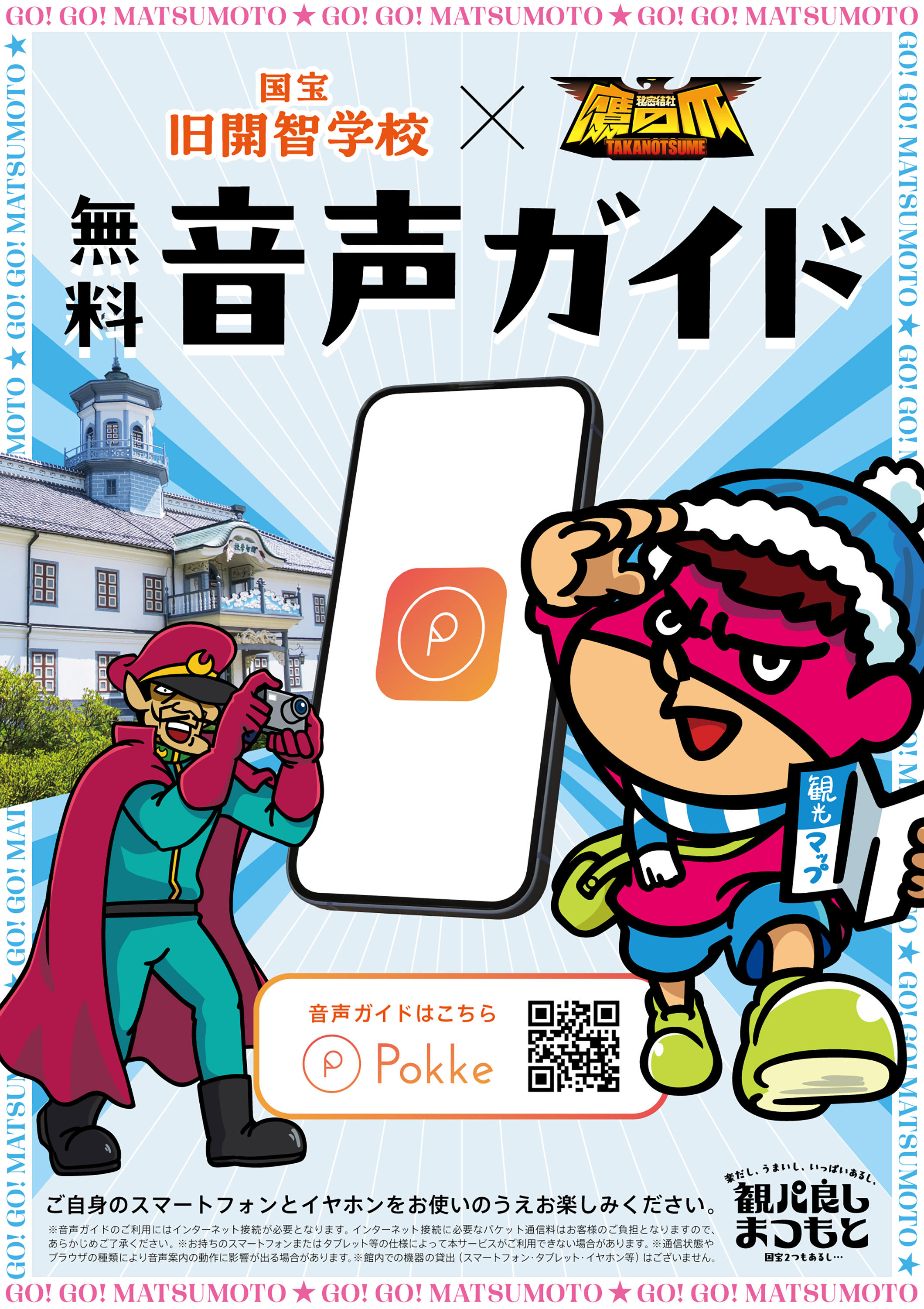 旧開智学校では、鷹の爪団が面白くおもしろく解説する音声ガイドを無料で利用できます。