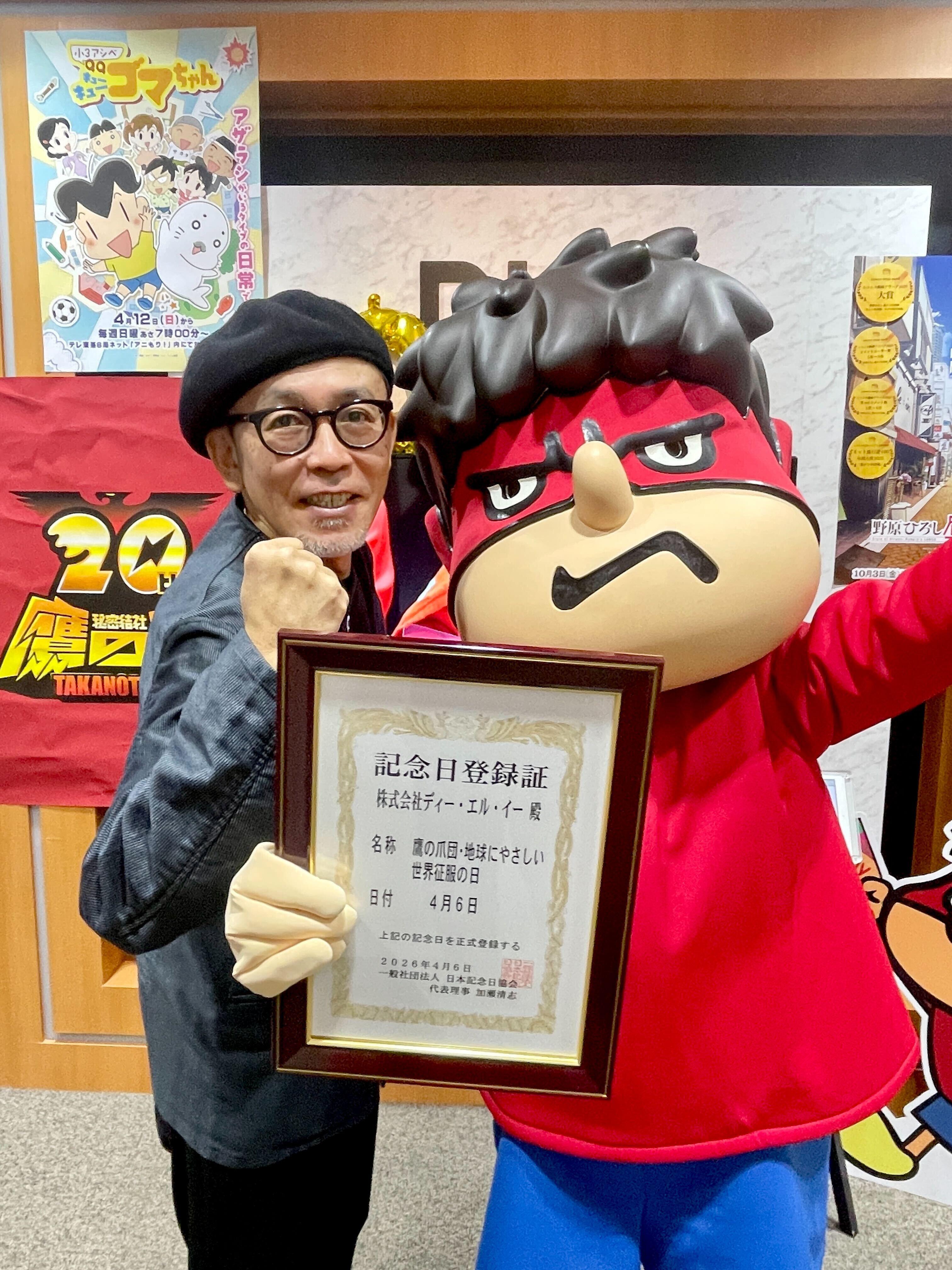 株式会社ディー・エル・イー(本社:東京都 千代田区、代表取締役社長 CEO・CCO:小野 亮、以下 DLE)は、4月6日を「鷹の爪団・地球にやさしい世界征服の日」として、一般社団法人 日本記念日協会に申請し、正式に登録・制定されたことをお知らせいたします。